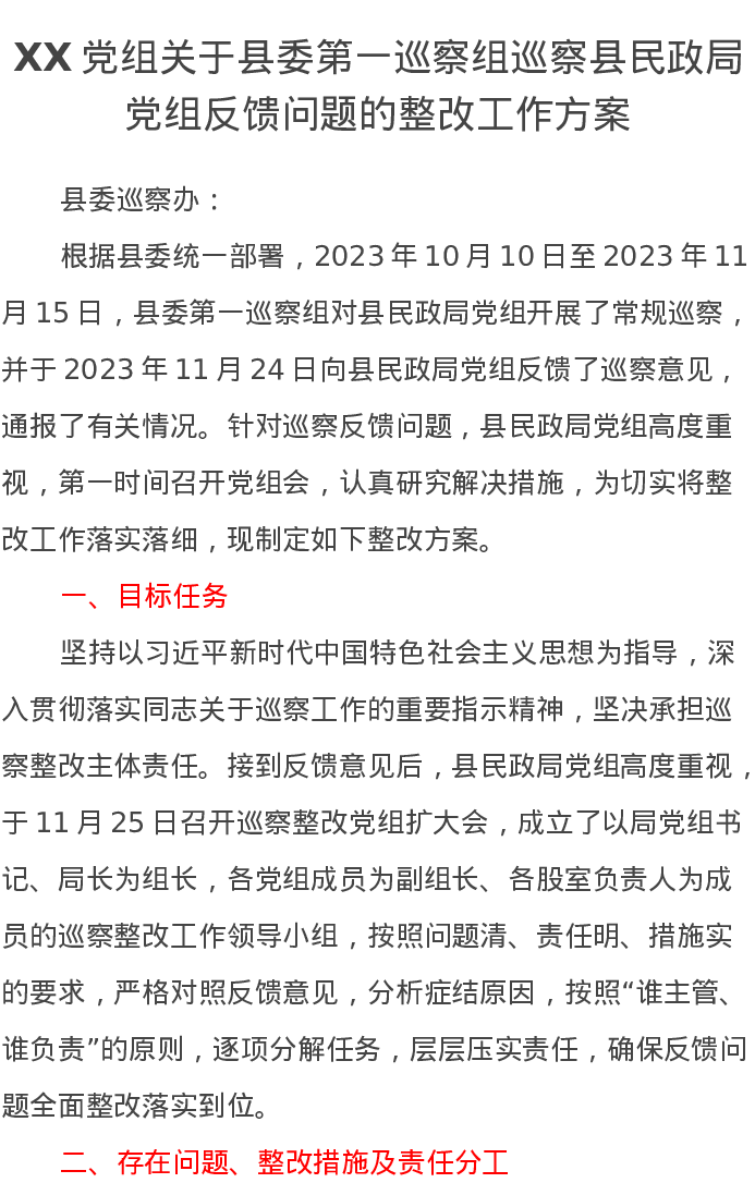 XX党组关于县委第一巡察组巡察县民政局党组反馈问题的整改工作方案