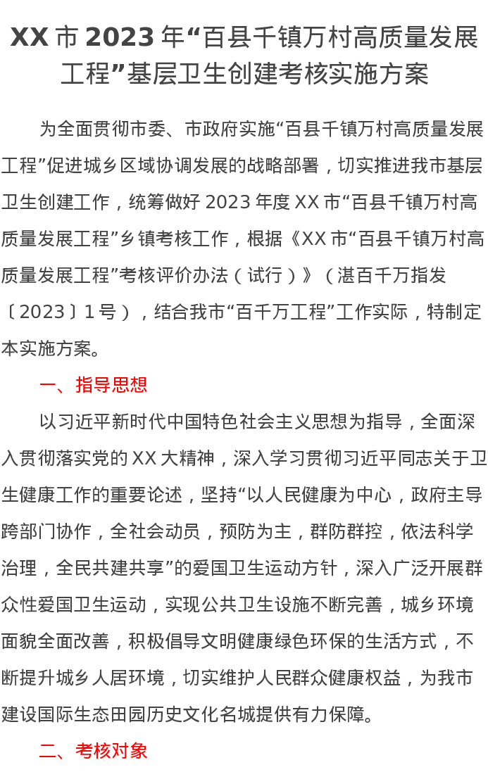 XX市2023年“百县千镇万村高质量发展工程”基层卫生创建考核实施方案