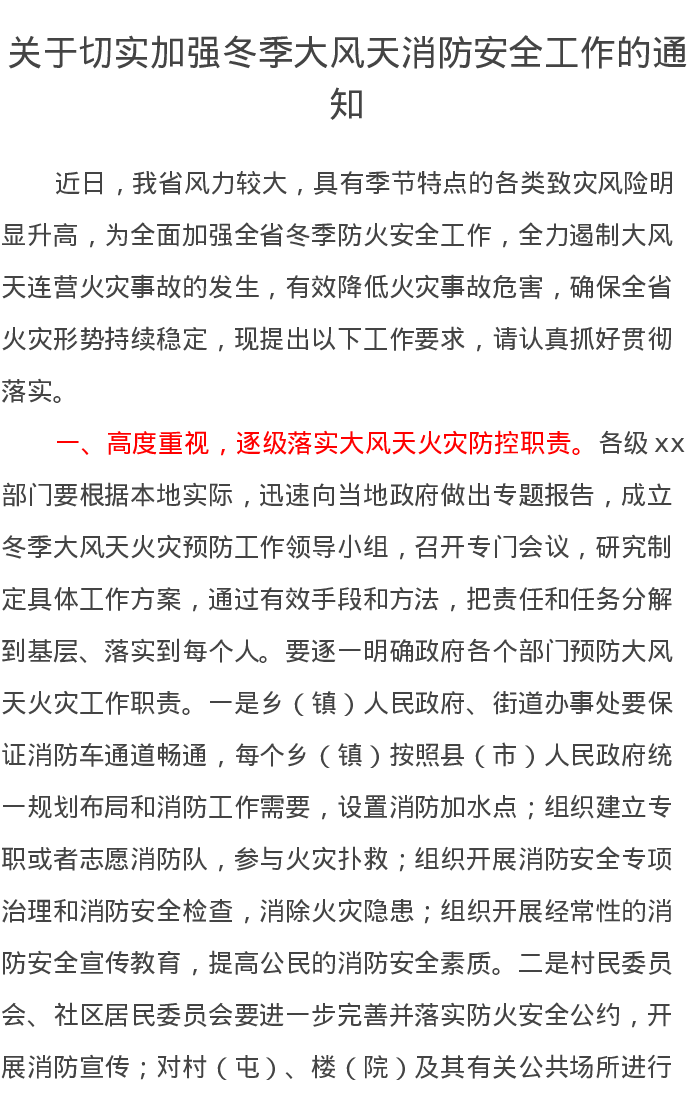 关于切实加强冬季大风天消防安全工作的通知