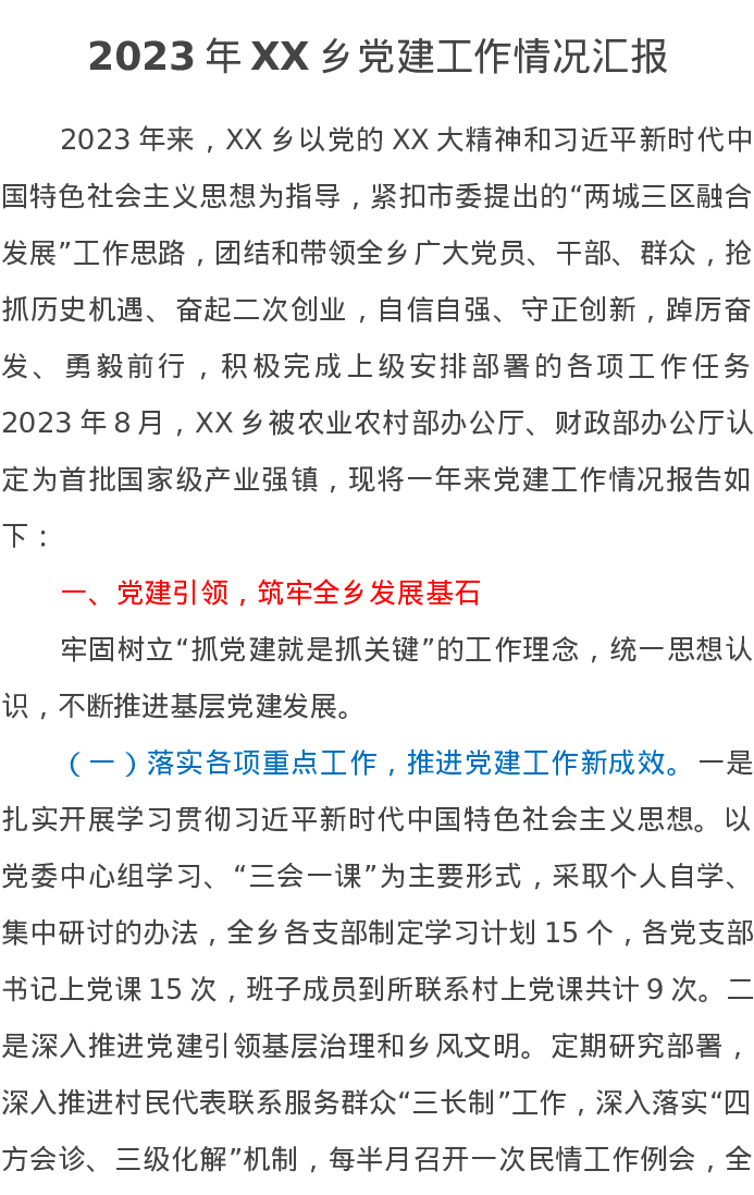 2023年XX乡党建工作情况汇报