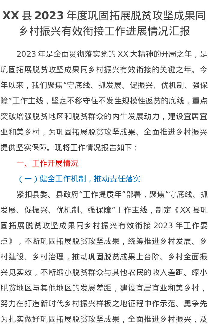 XX县2023年度巩固拓展脱贫攻坚成果同乡村振兴有效衔接工作进展情况汇报