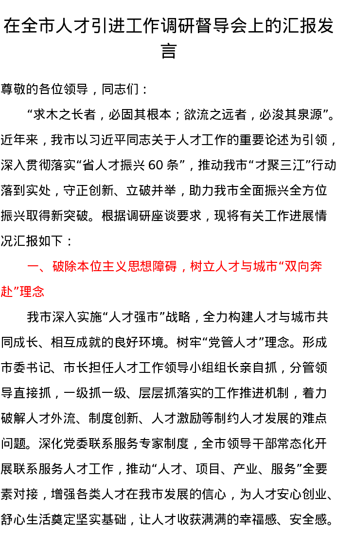 在全市人才引进工作调研督导会上的汇报发言