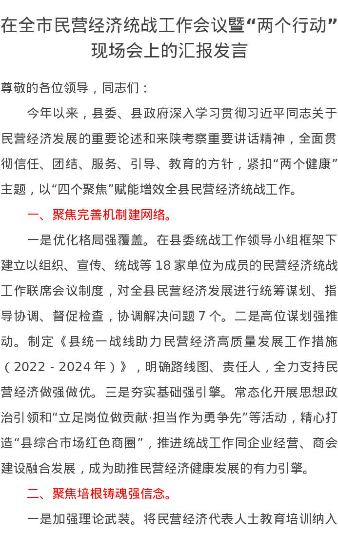 在全市民营经济统战工作会议暨“两个行动”现场会上的汇报发言
