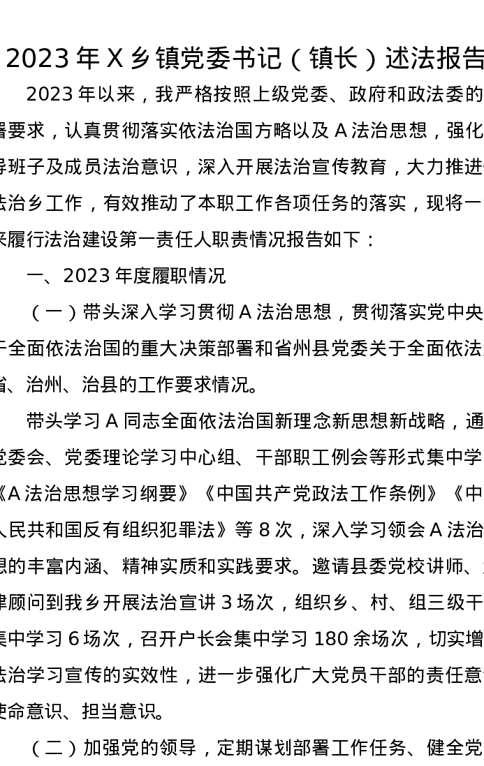 2023年X乡镇党委书记(镇长)述法报告