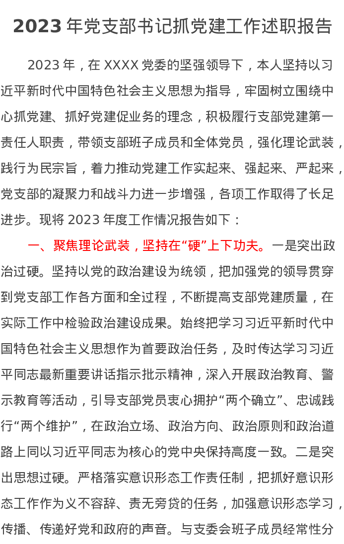 2023年党支部书记抓党建工作述职报告