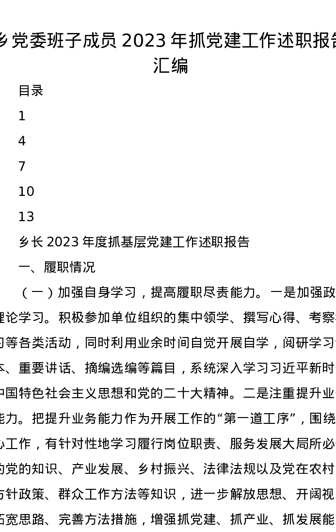 乡党委班子成员2023年抓党建工作述职报告汇编
