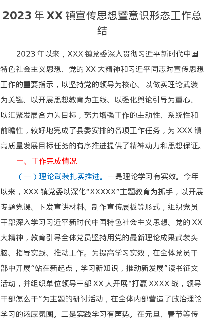 2023年XX镇宣传思想暨意识形态工作总结