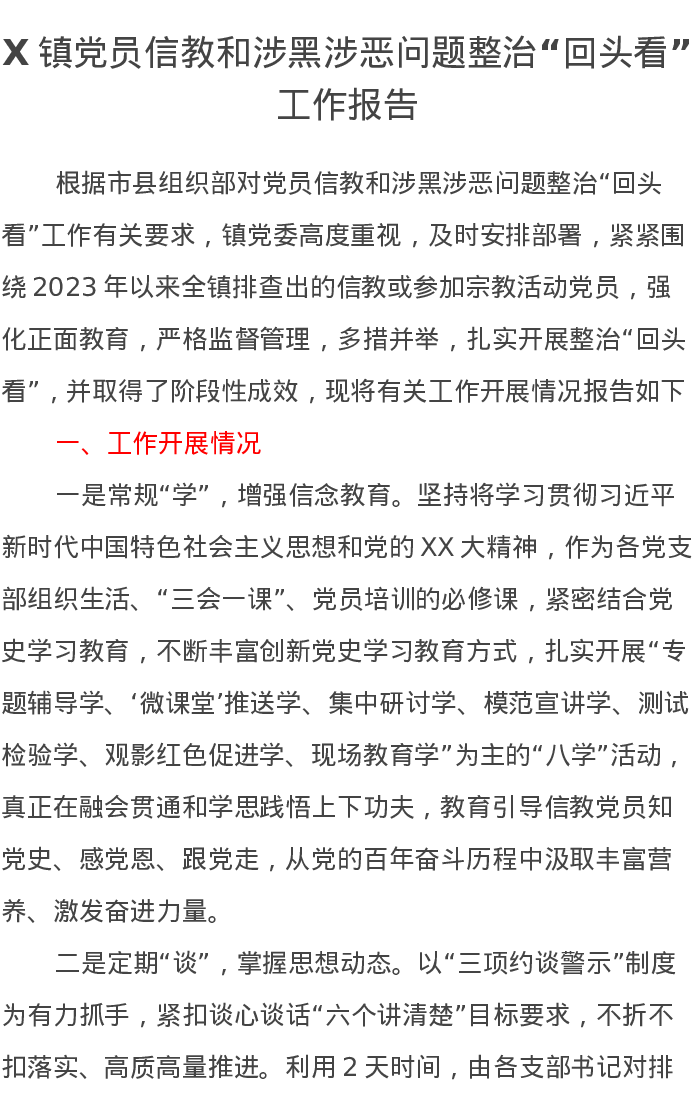 X镇党员信教和涉黑涉恶问题整治“回头看”工作报告