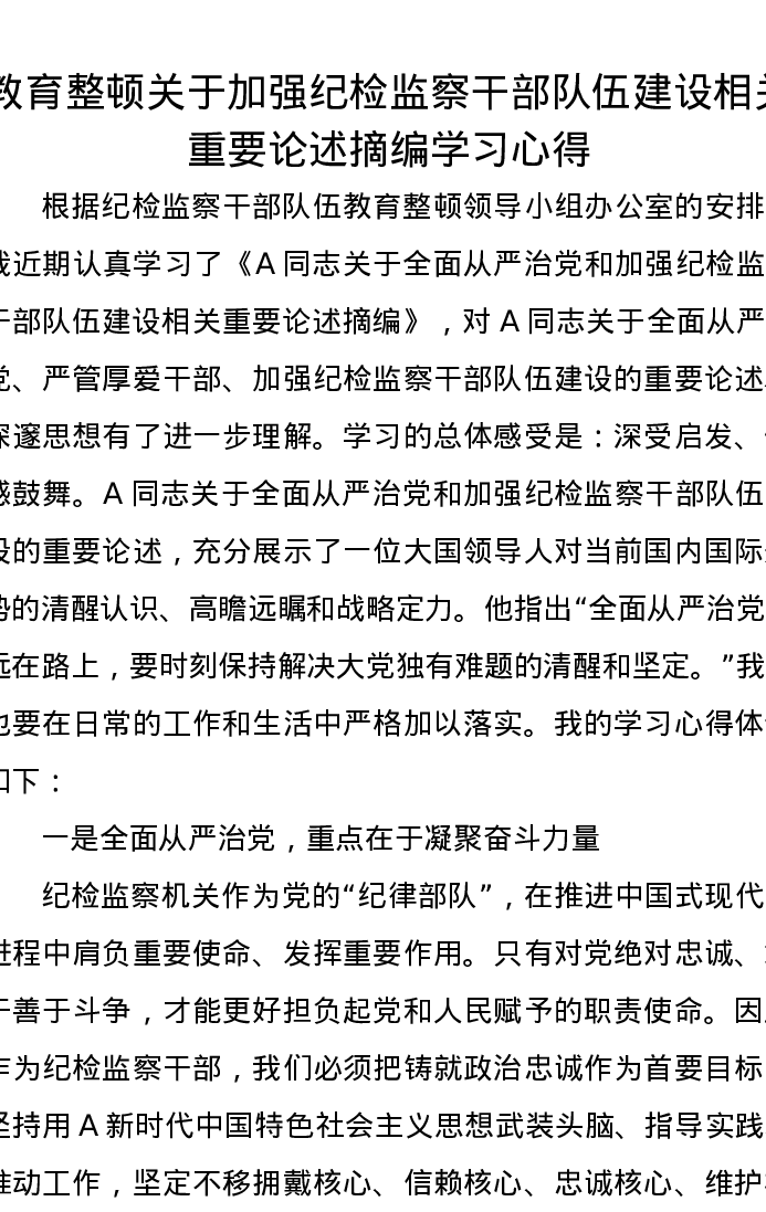 教育整顿关于加强纪检监察干部队伍建设相关重要论述摘编学习心得