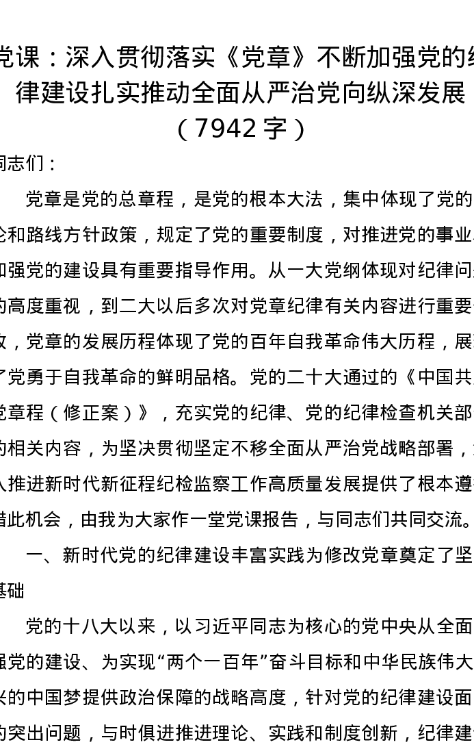 党课讲稿:深入贯彻落实《党章》不断加强党的纪律建设扎实推动全面从严治党向纵深发展