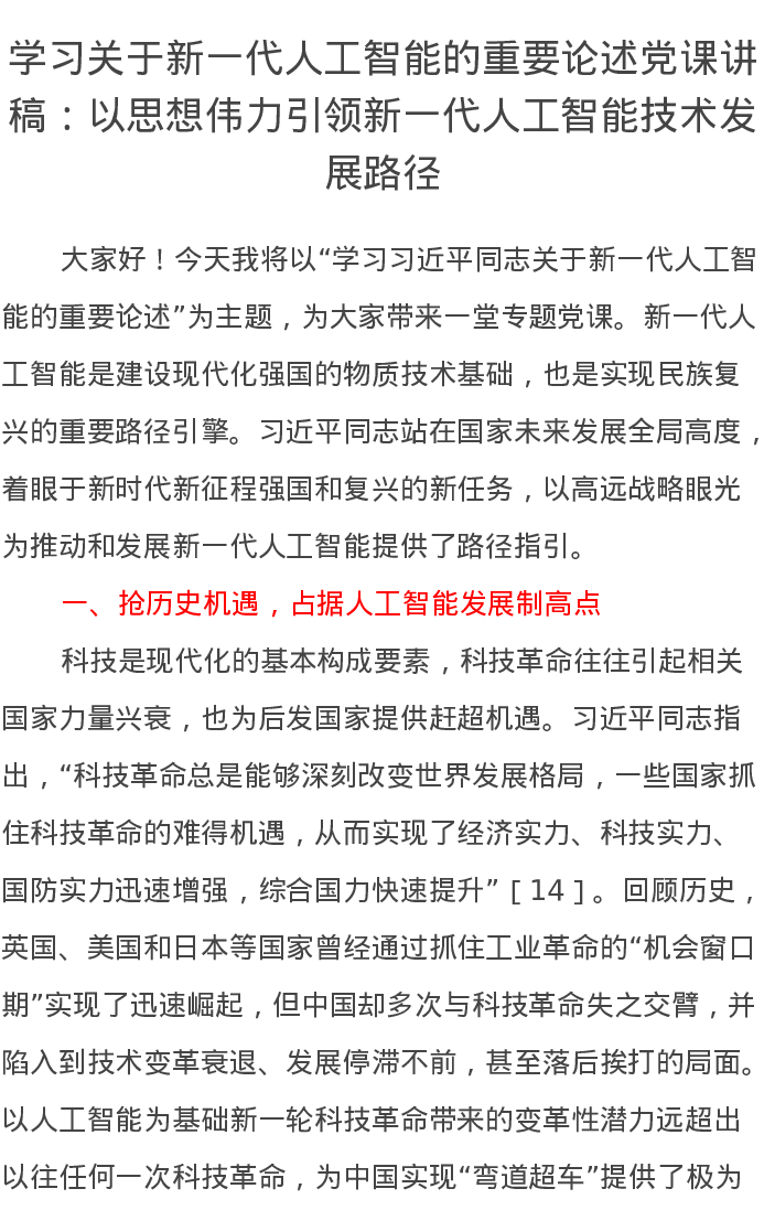 学习关于新一代人工智能的重要论述党课讲稿:以思想伟力引领新一代人工智能技术发展路径