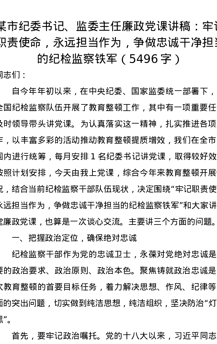 某市纪委书记、监委主任廉政党课讲稿:牢记职责使命,永远担当作为,争做忠诚干净担当的纪检监察铁军