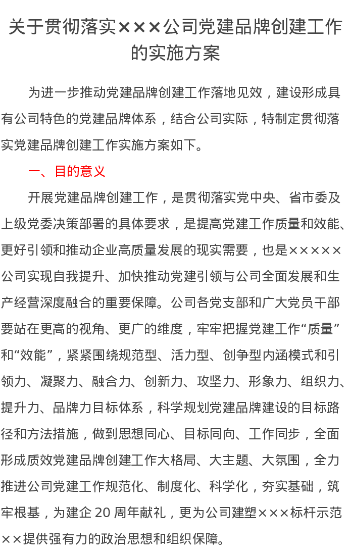 关于贯彻落实×××公司党建品牌创建工作的实施方案