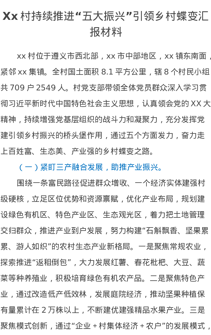 Xx村持续推进“五大振兴”引领乡村蝶变汇报材料
