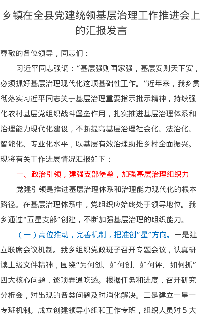 X乡镇在全县党建统领基层治理工作推进会上的汇报发言