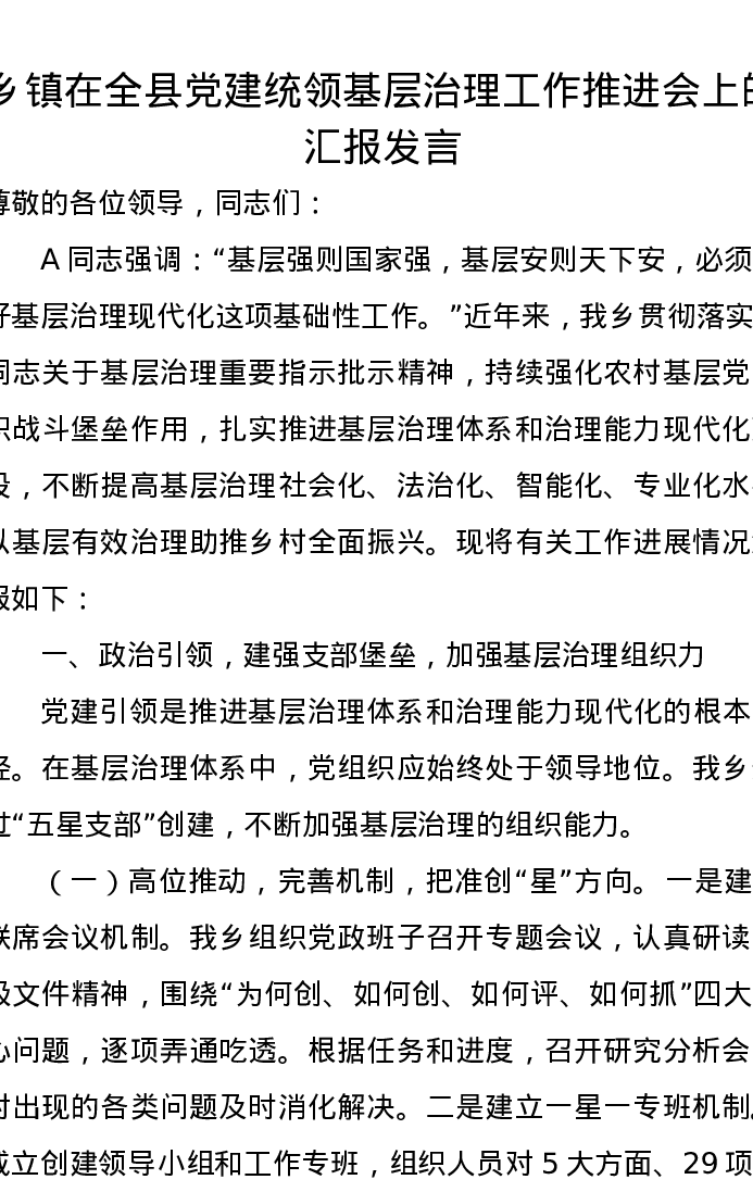 乡镇在全县党建统领基层治理工作推进会上的汇报发言