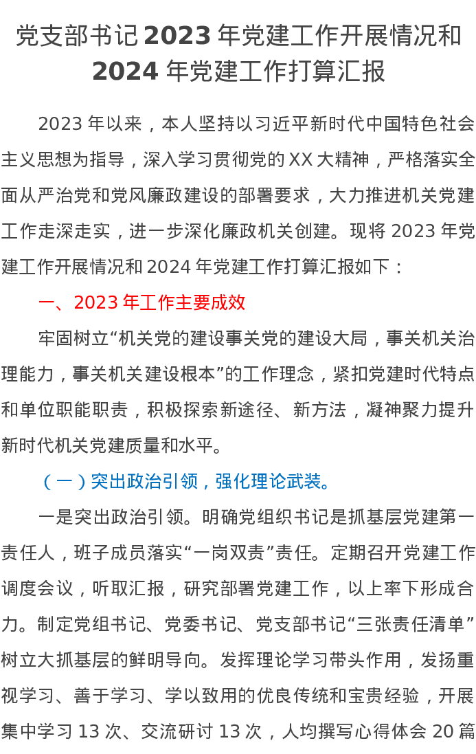 党支部书记2023年党建工作开展情况和2024年党建工作打算汇报