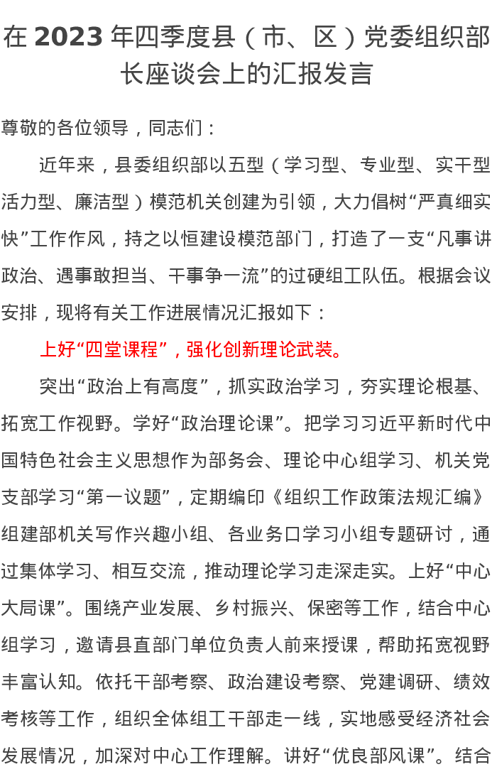 在2023年四季度县(市、区)党委组织部长座谈会上的汇报发言