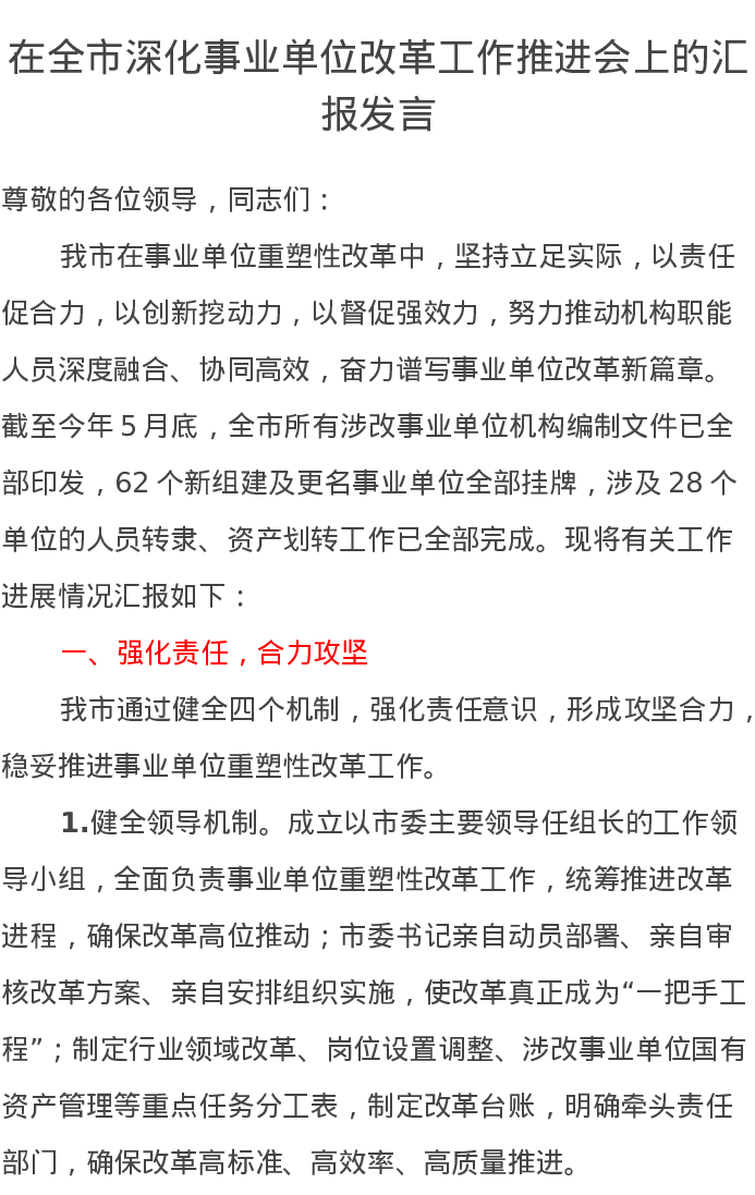 在全市深化事业单位改革工作推进会上的汇报发言