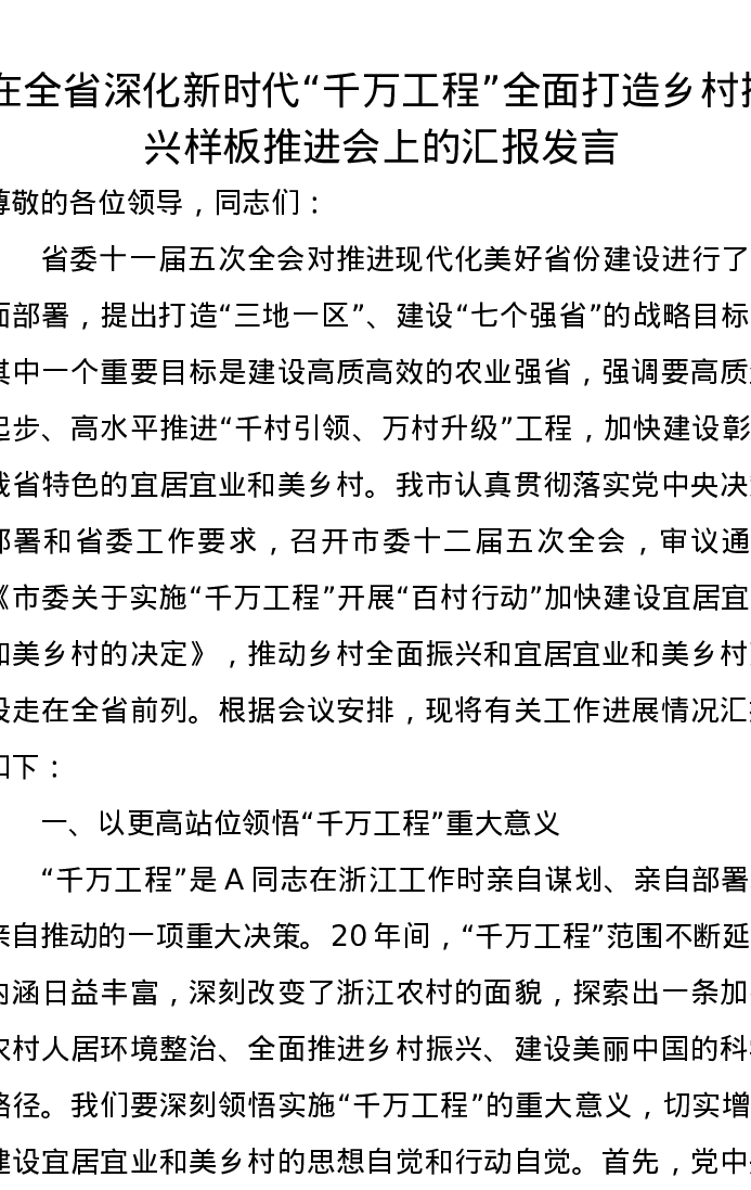 在全省深化新时代“千万工程”全面打造乡村振兴样板推进会上的汇报发言