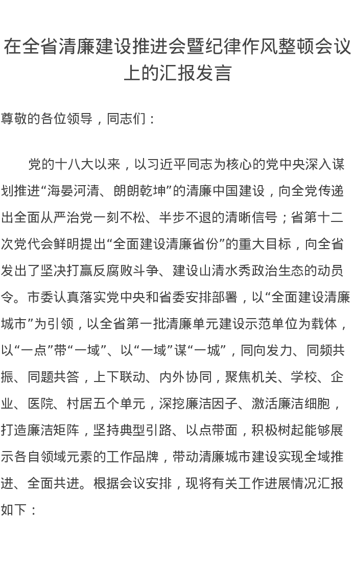 在全省清廉建设推进会暨纪律作风整顿会议上的汇报发言
