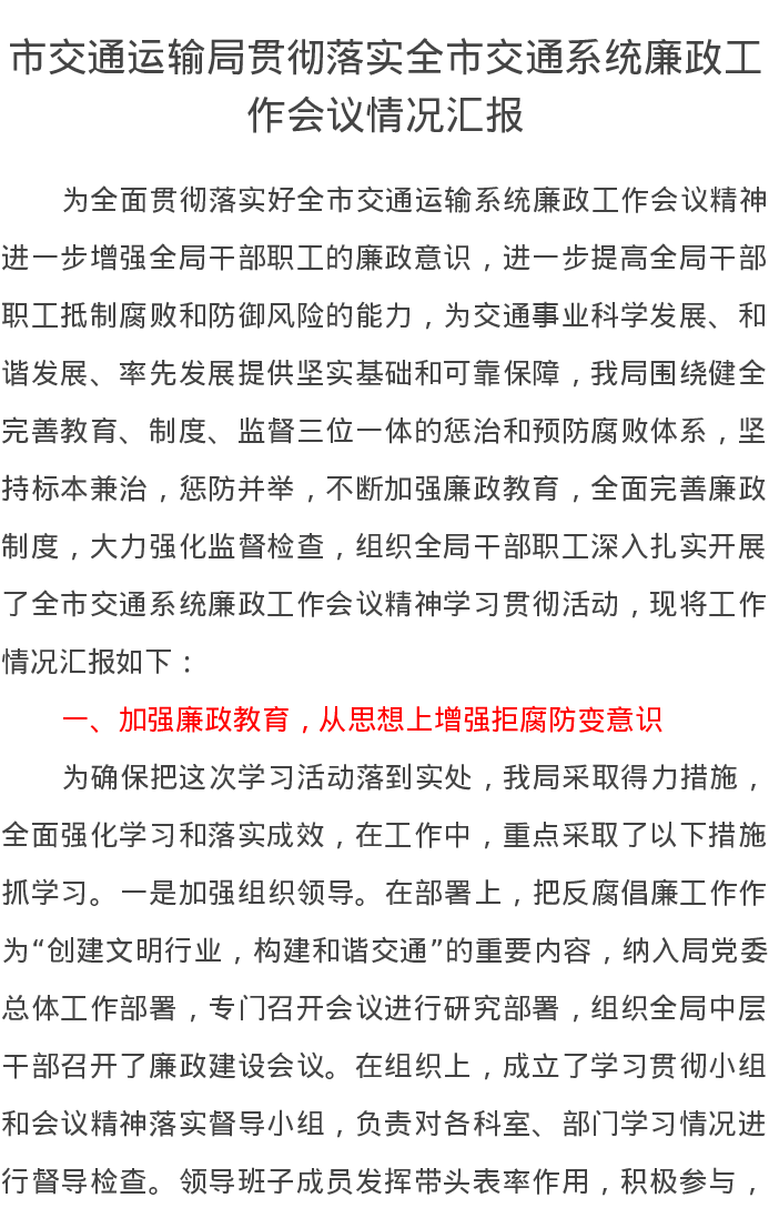 市交通运输局贯彻落实全市交通系统廉政工作会议情况汇报