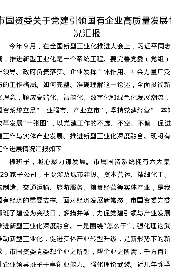 市国资委关于党建引领国有企业高质量发展情况汇报