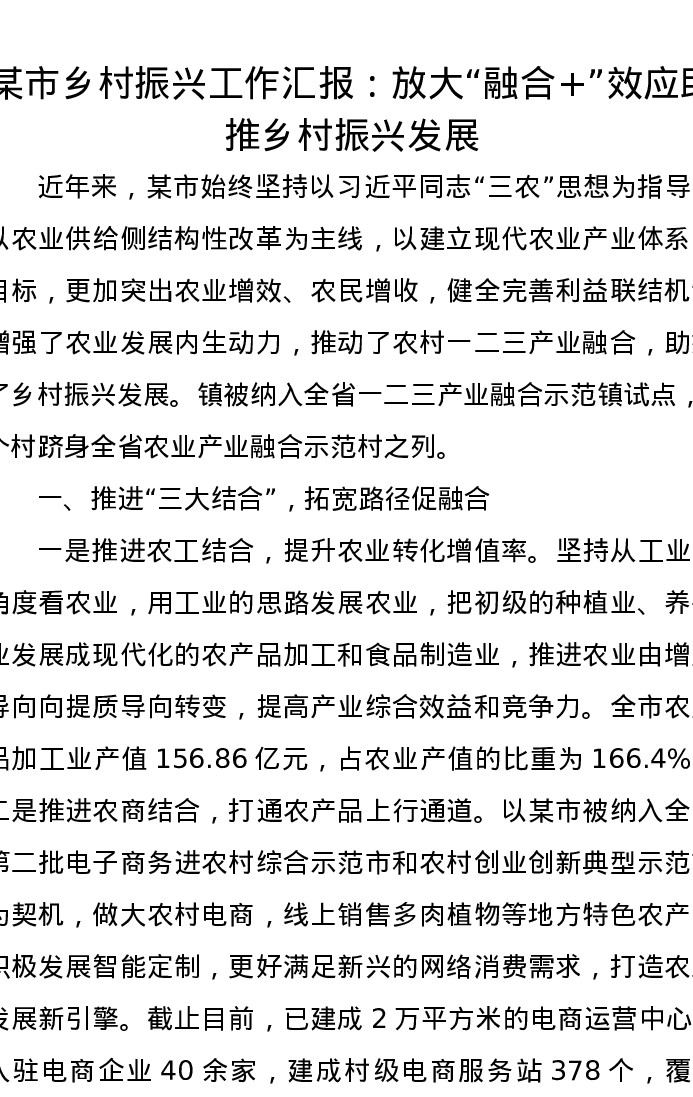 某市乡村振兴工作汇报:放大“融合+”效应助推乡村振兴发展
