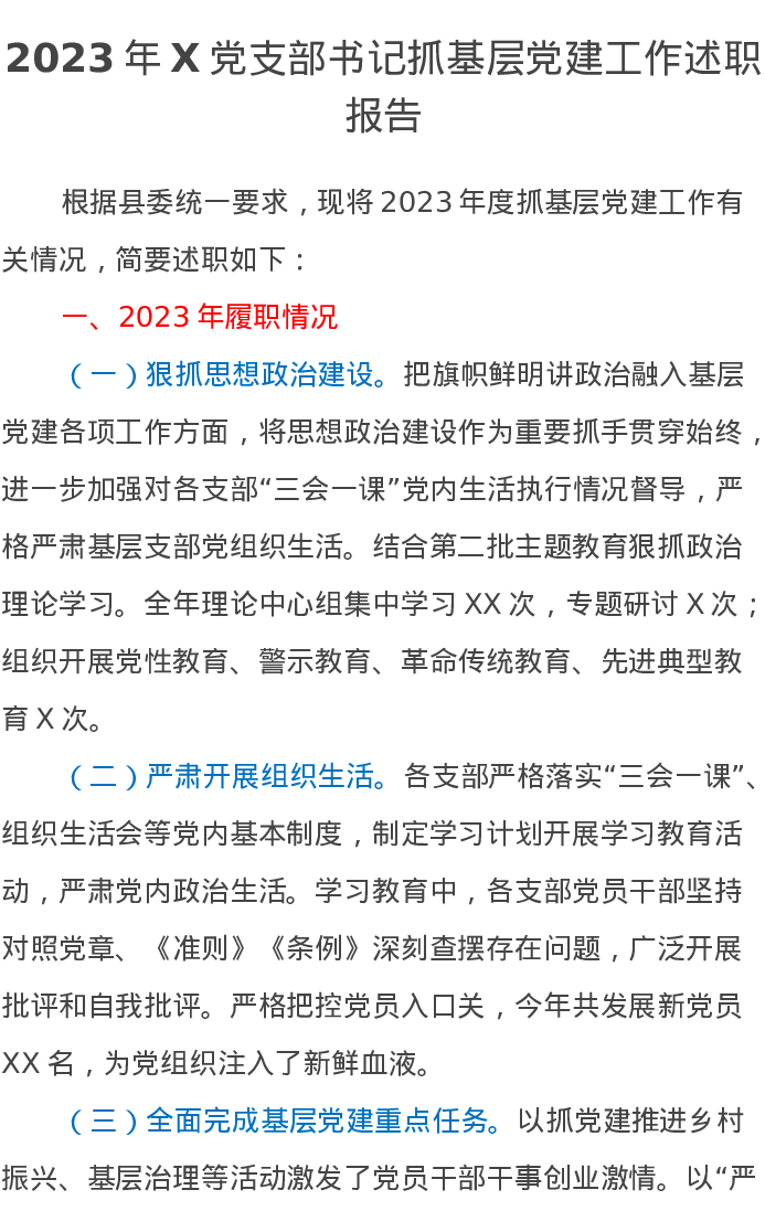2023年X党支部书记抓基层党建工作述职报告