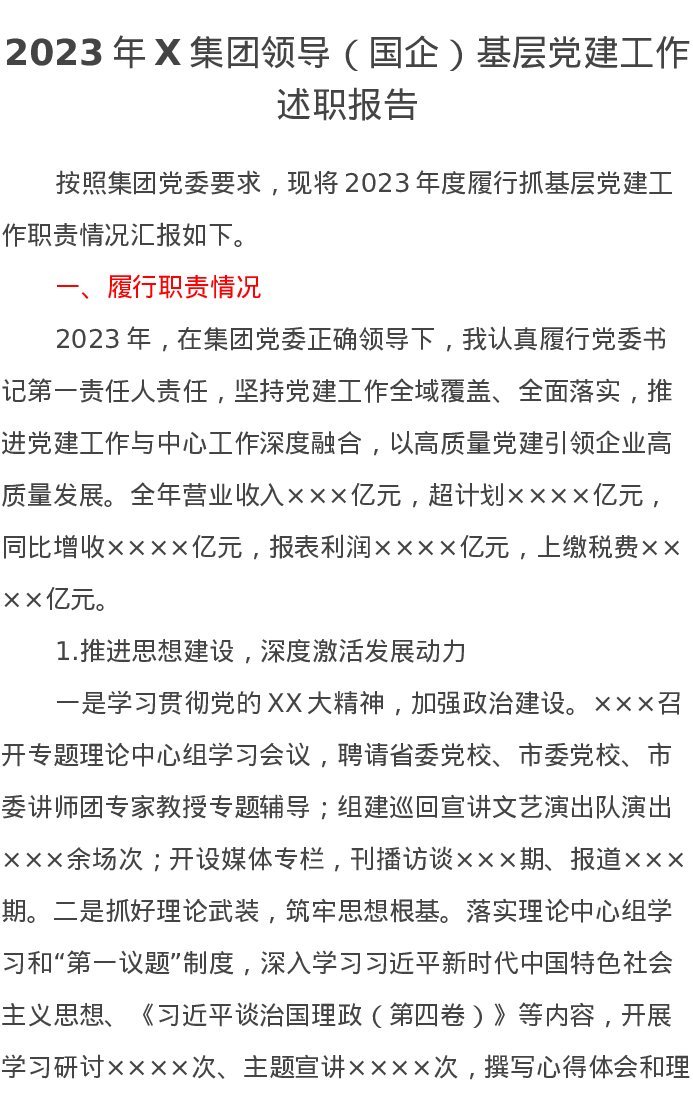 2023年X集团领导(国企)抓基层党建工作述职报告