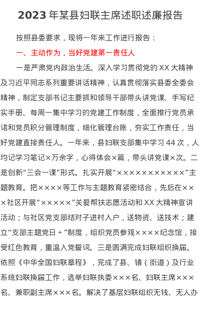 2023年某县妇联主席述职述廉报告