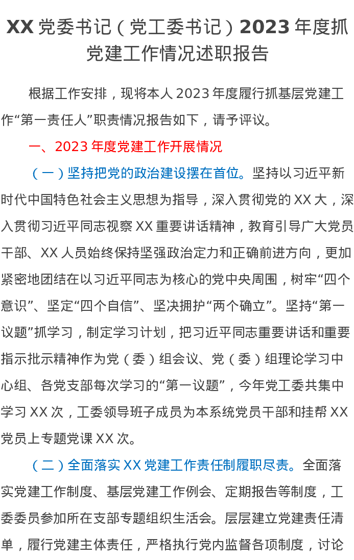 XX党委书记(党工委书记)2023年度抓党建工作情况述职报告