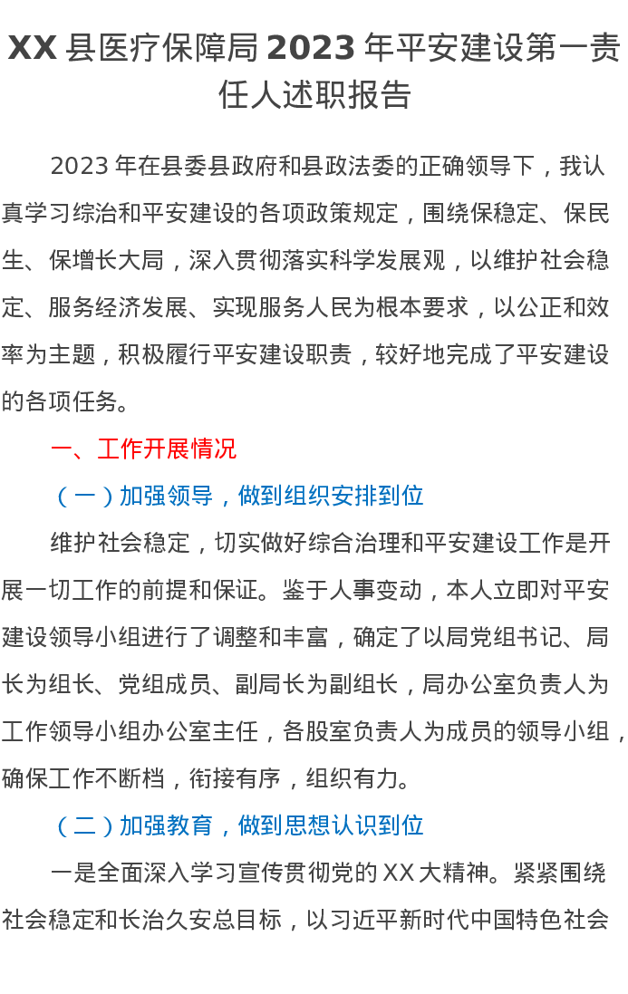 XX县医疗保障局2023年平安建设第一责任人述职报告