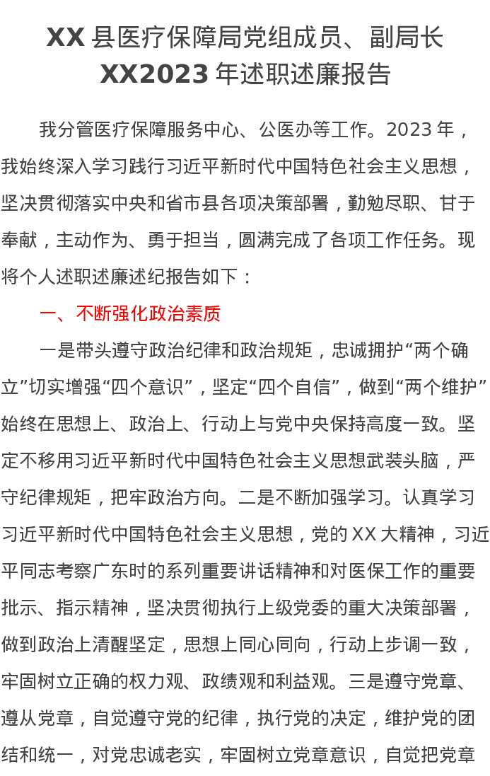 XX县医疗保障局党组成员、副局长XX2023年述职述廉报告
