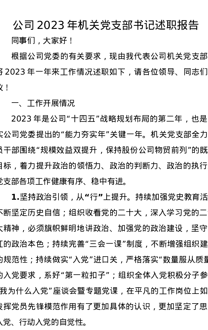 公司2023年机关党支部书记述职报告