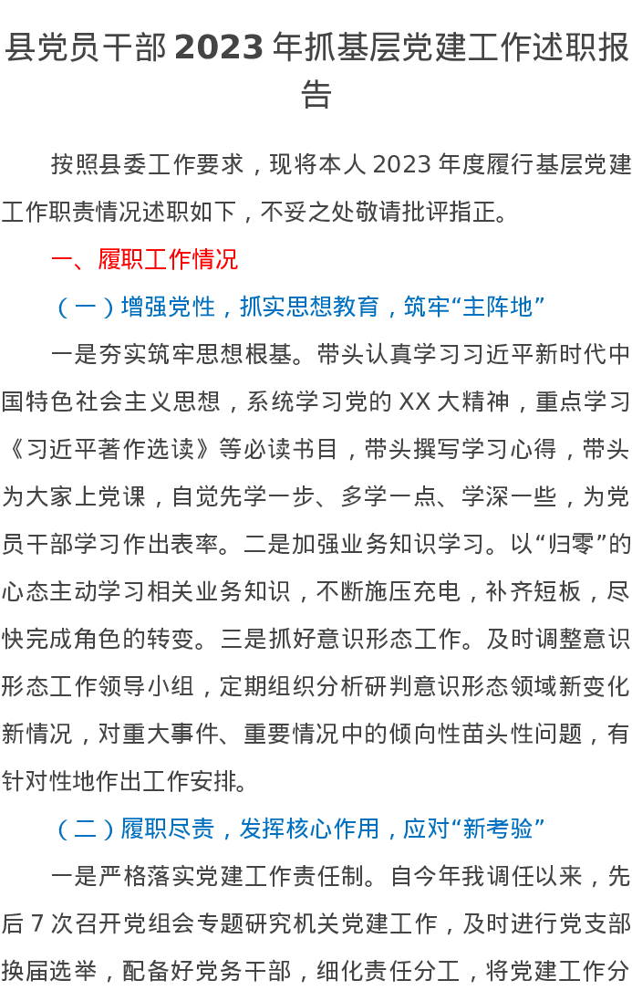 县党员干部2023年抓基层党建工作述职报告