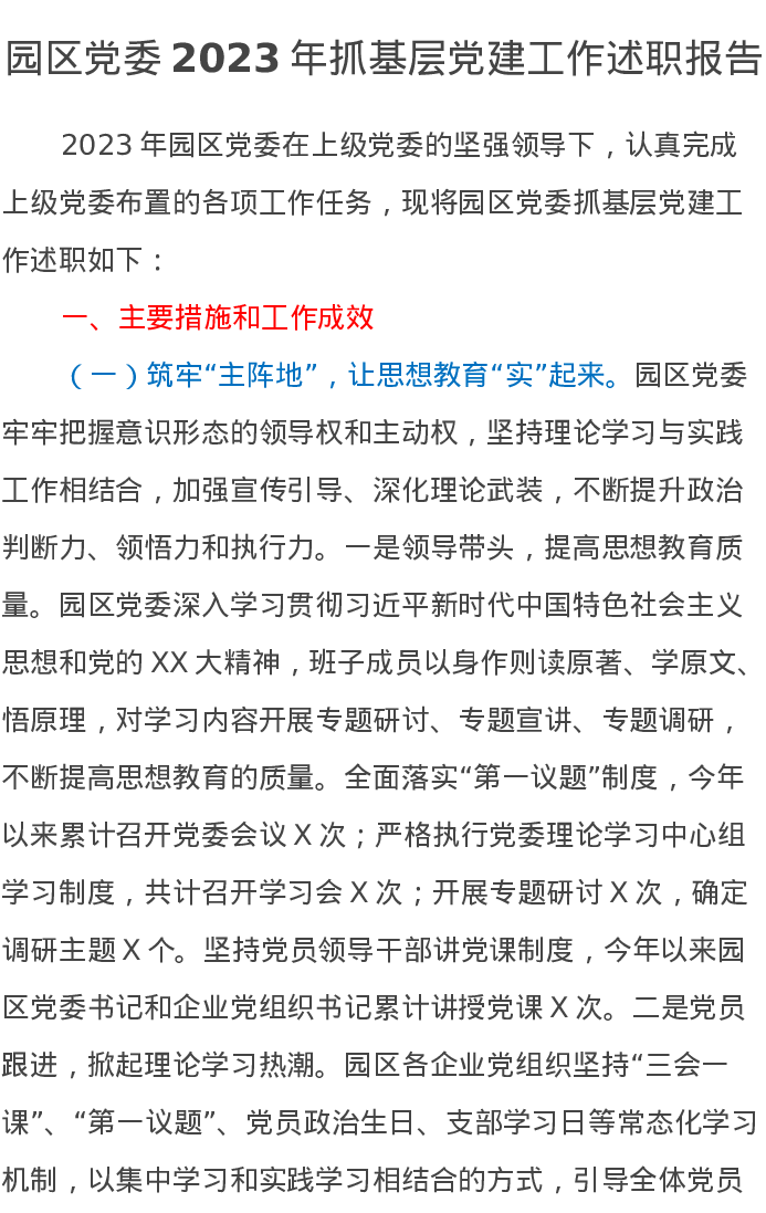 园区党委2023年抓基层党建工作述职报告
