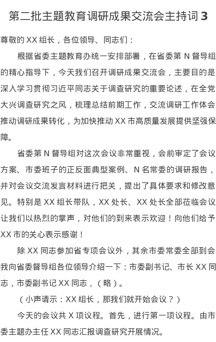 第二批主题教育调研成果交流会主持词3(特色社会主义思想)