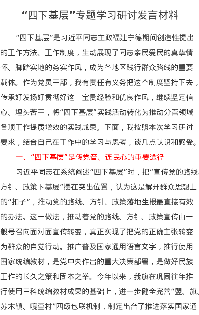 “四下基层”专题学习研讨发言材料(特色社会主义思想主题教育)