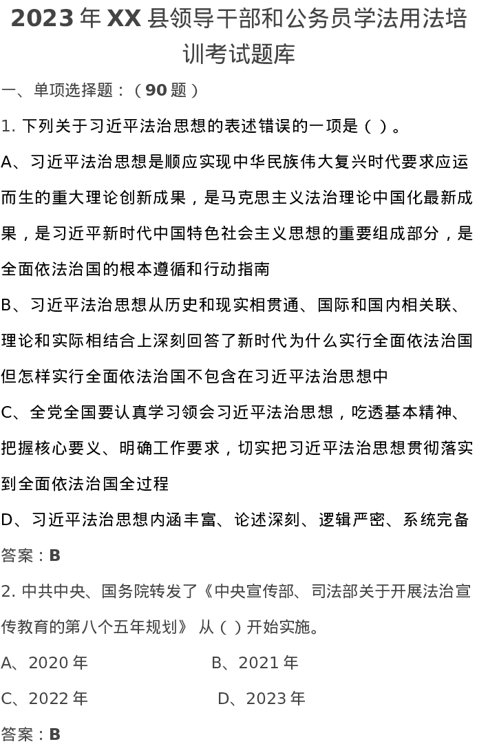 2023年XX县领导干部和公务员学法用法培训考试题库