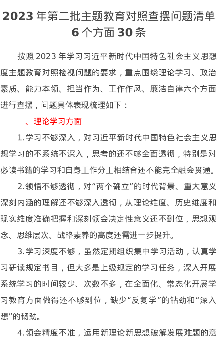 2023年第二批主题教育对照查摆问题清单6个方面30条(特色社会主义思想)