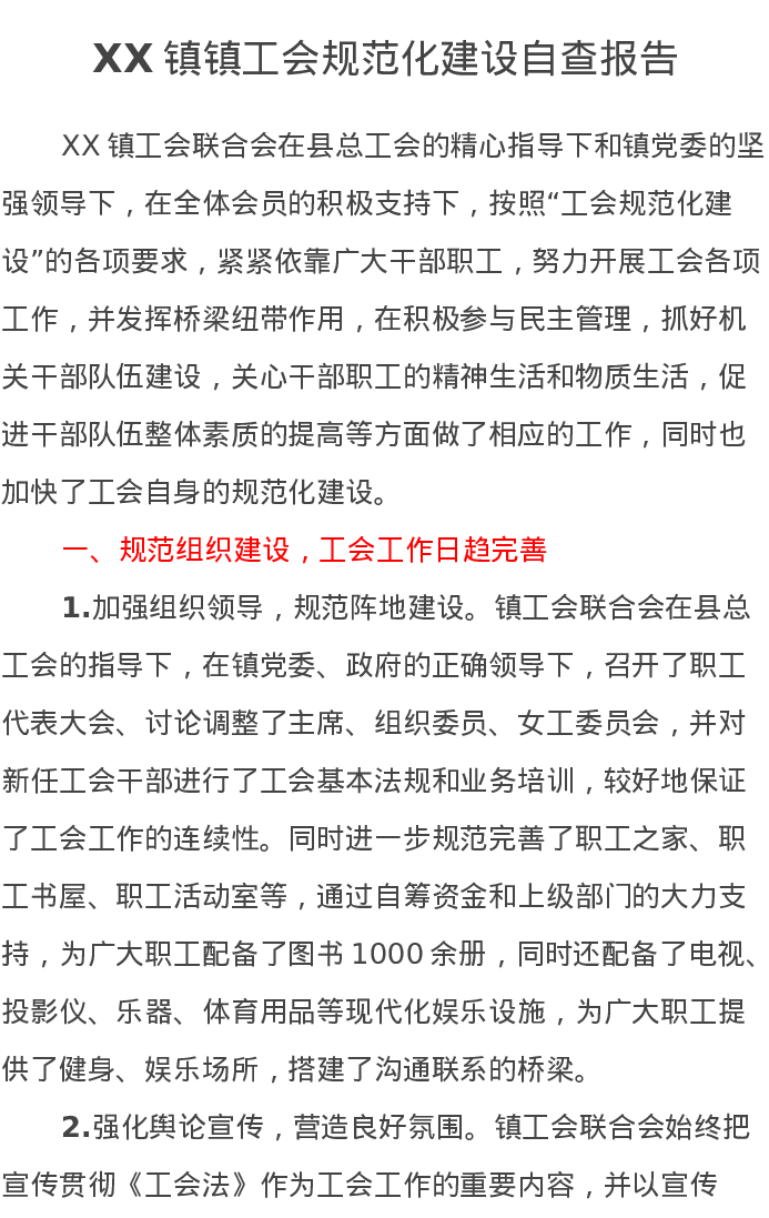 XX镇镇工会规范化建设自查报告