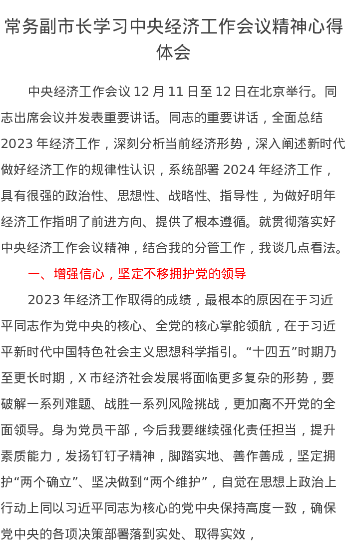 常务副市长学习中央经济工作会议精神心得体会