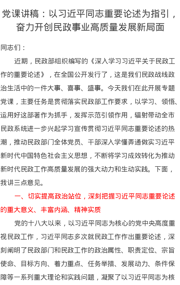 党课讲稿:以习近平总书记重要论述为指引,奋力开创民政事业高质量发展新局面