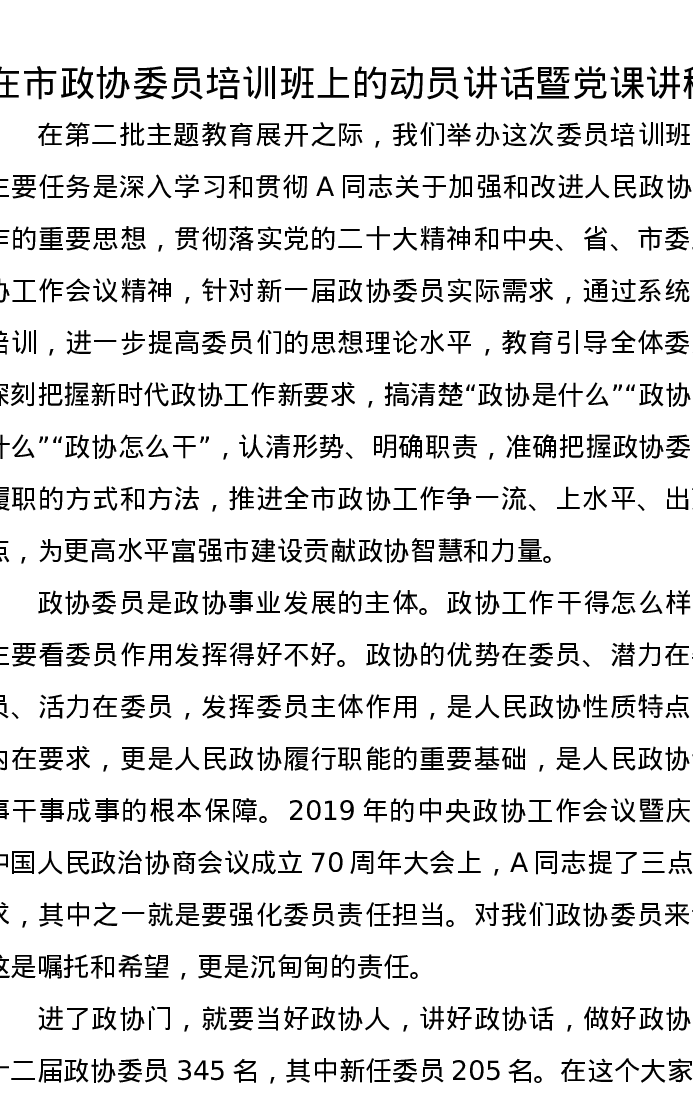 在市政协委员培训班上的动员讲话暨党课讲稿