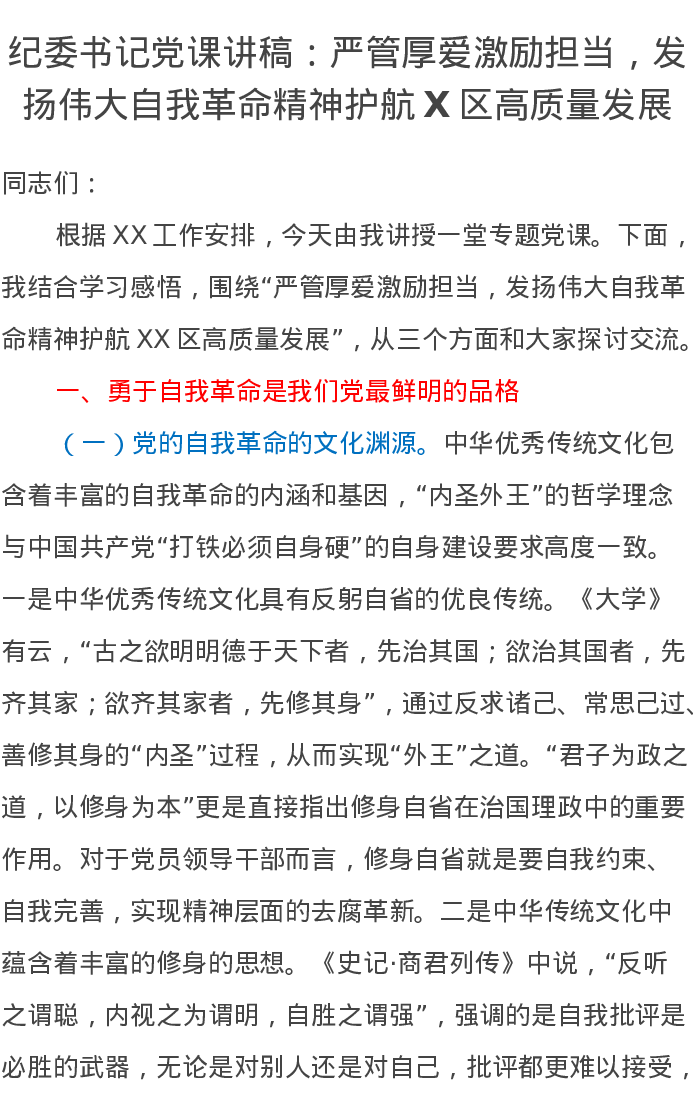 纪委书记党课讲稿:严管厚爱激励担当,发扬伟大自我革命精神护航X区高质量发展