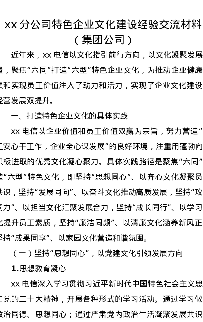 xx分公司特色企业文化建设经验交流材料(集团公司)