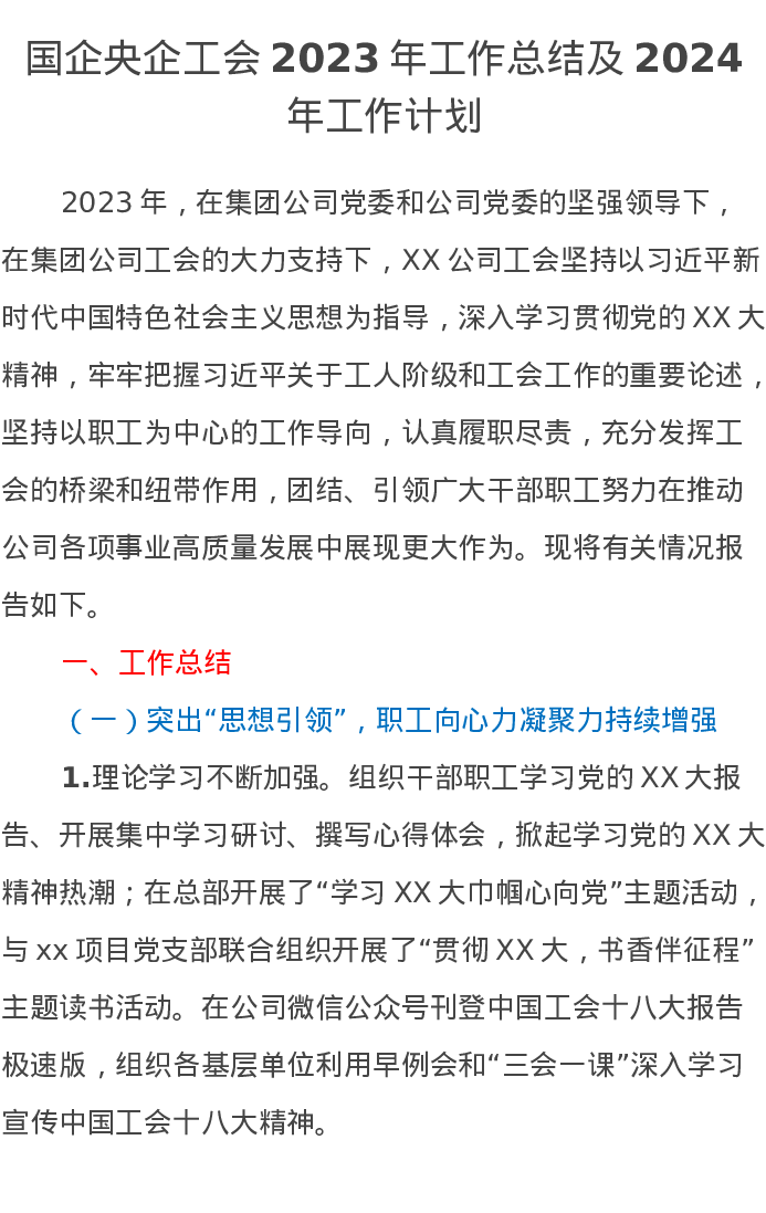 国企央企工会2023年工作总结及2024年工作计划