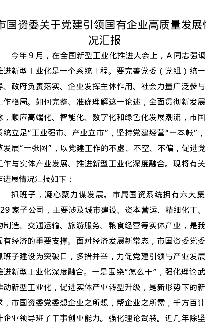 市国资委关于党建引领国有企业高质量发展情况汇报