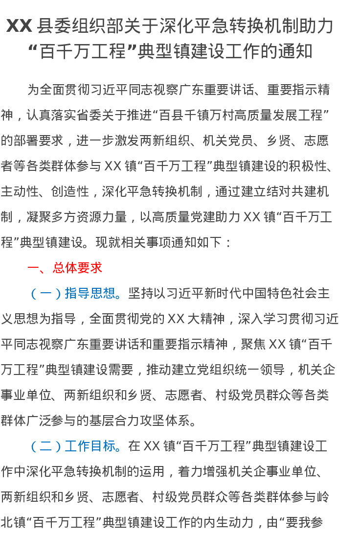 XX县委组织部关于深化平急转换机制助力“百千万工程”典型镇建设工作的通知